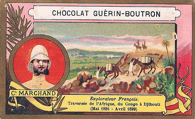 Deux chromos du chocolat Guérin-Boutron sur les principaux protagonistes de la crise de Fachoda (voir ci-dessus le papier à cigarettes Le Nil, pour quelques liens concernant l'affaire de Fachoda).