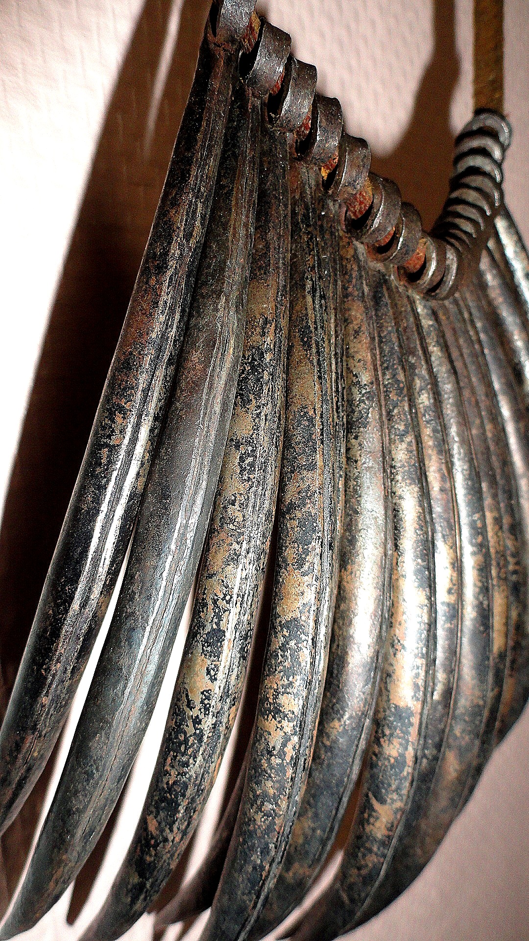 Vue rapprochée des 18 dents métalliques, montées sur une lanière de cuir