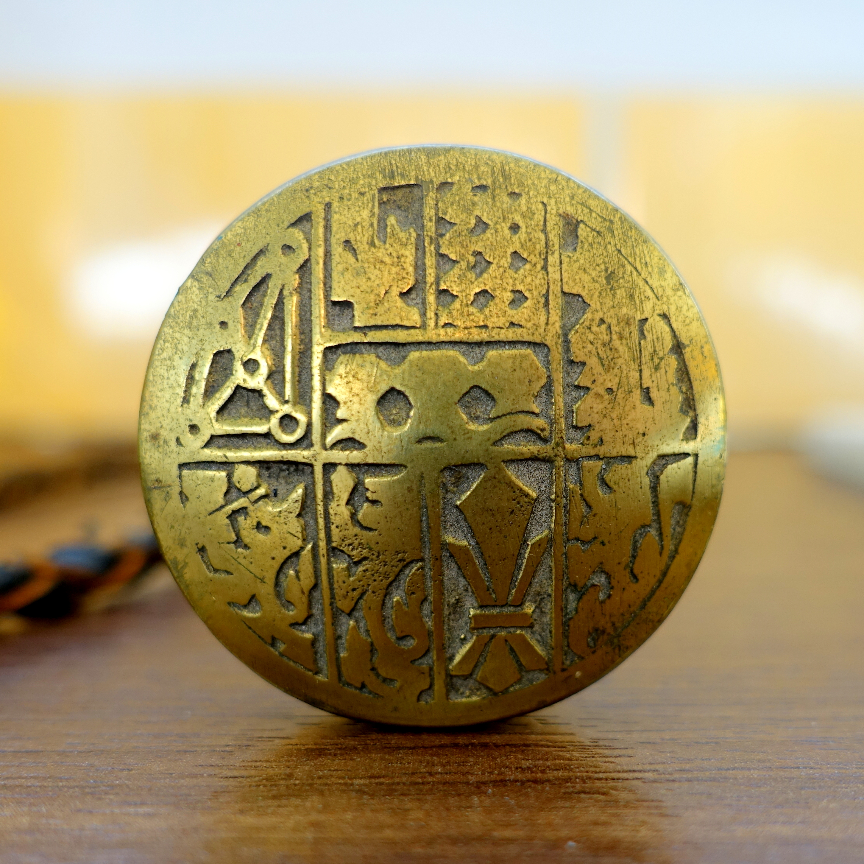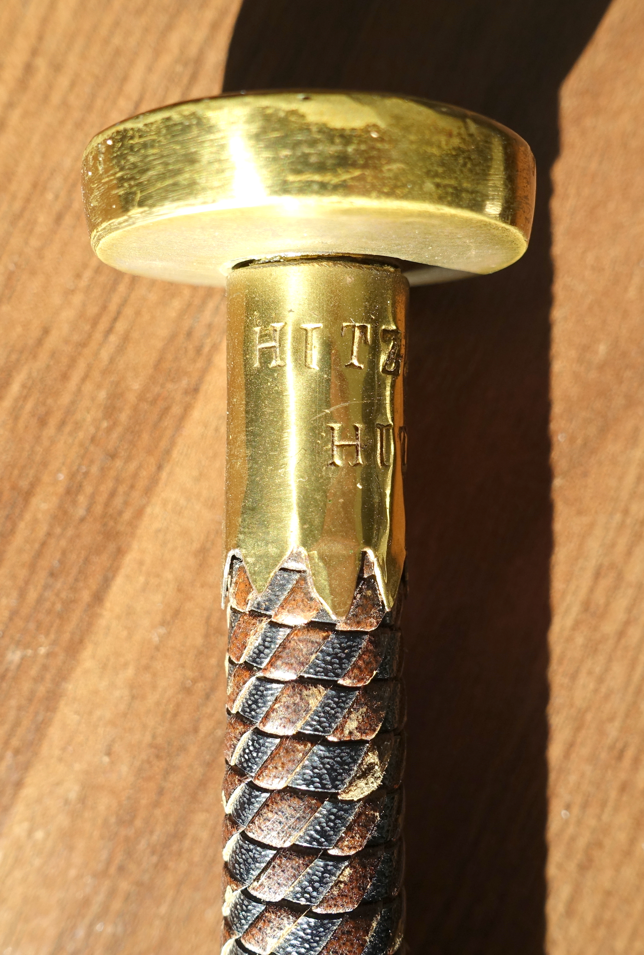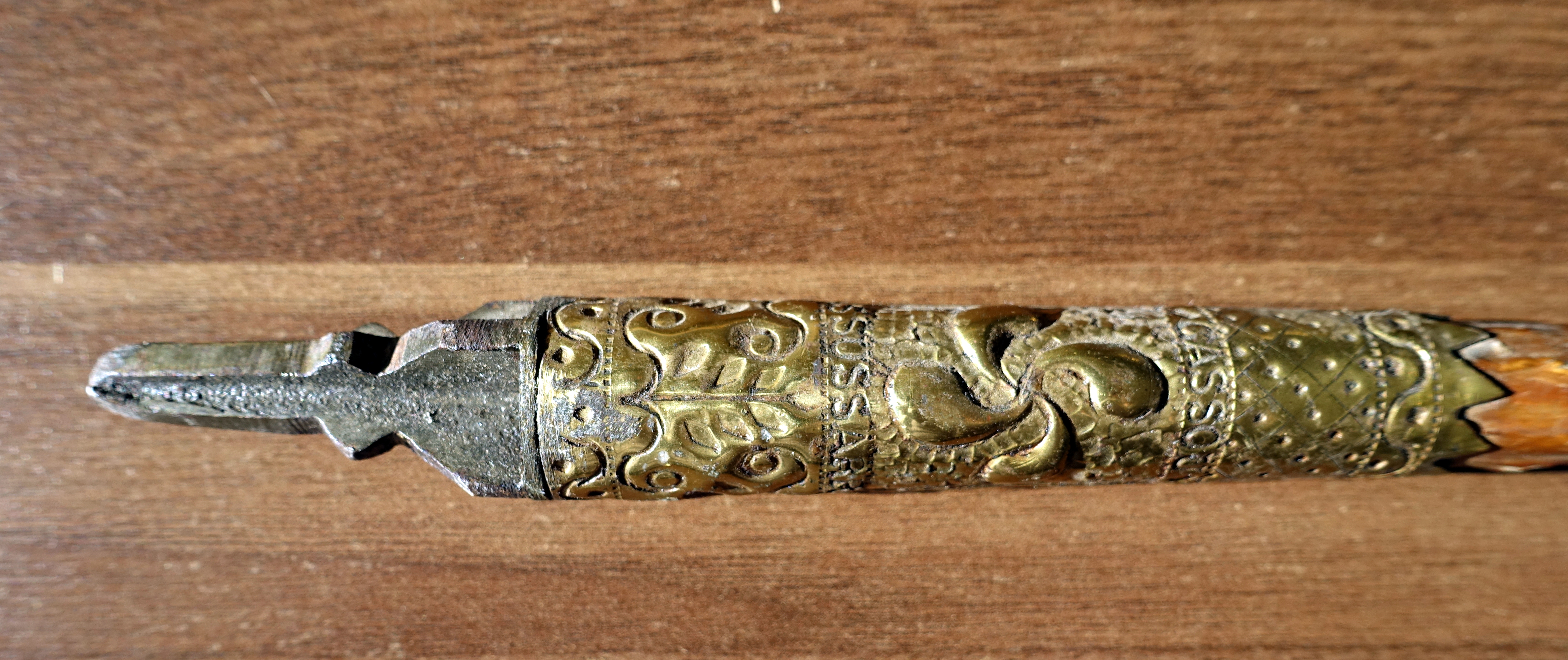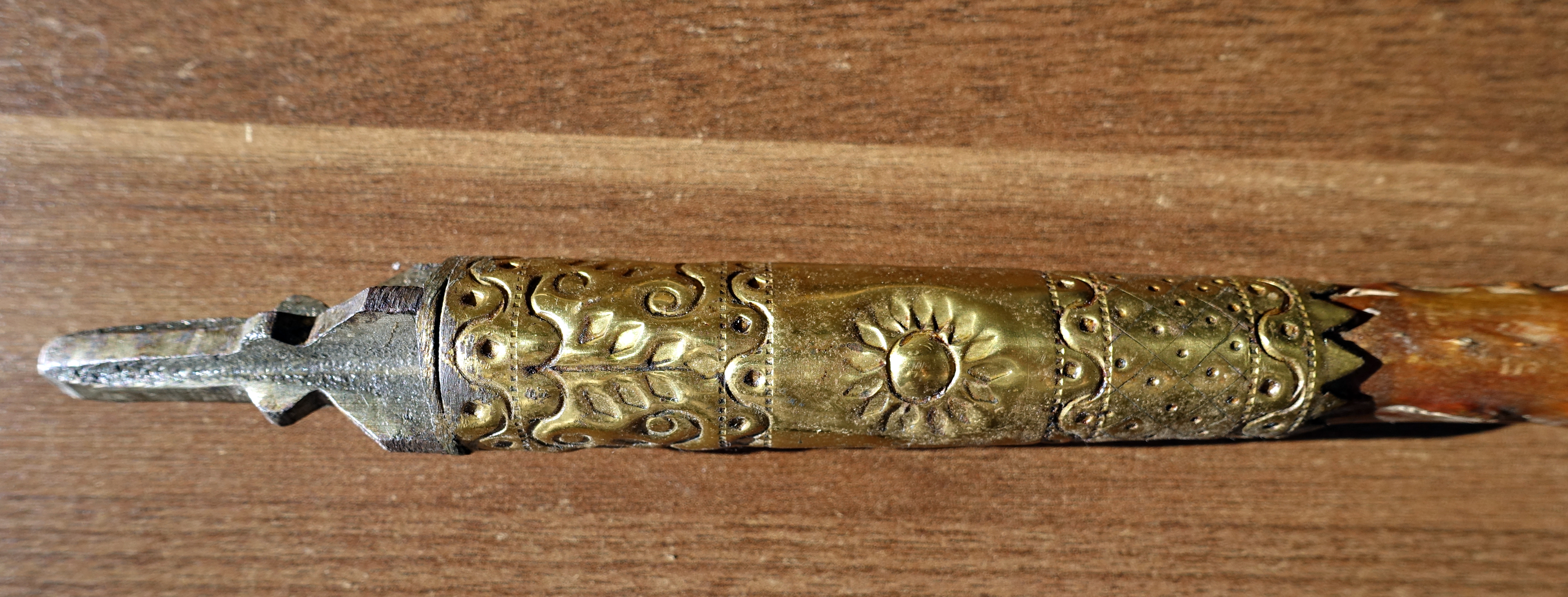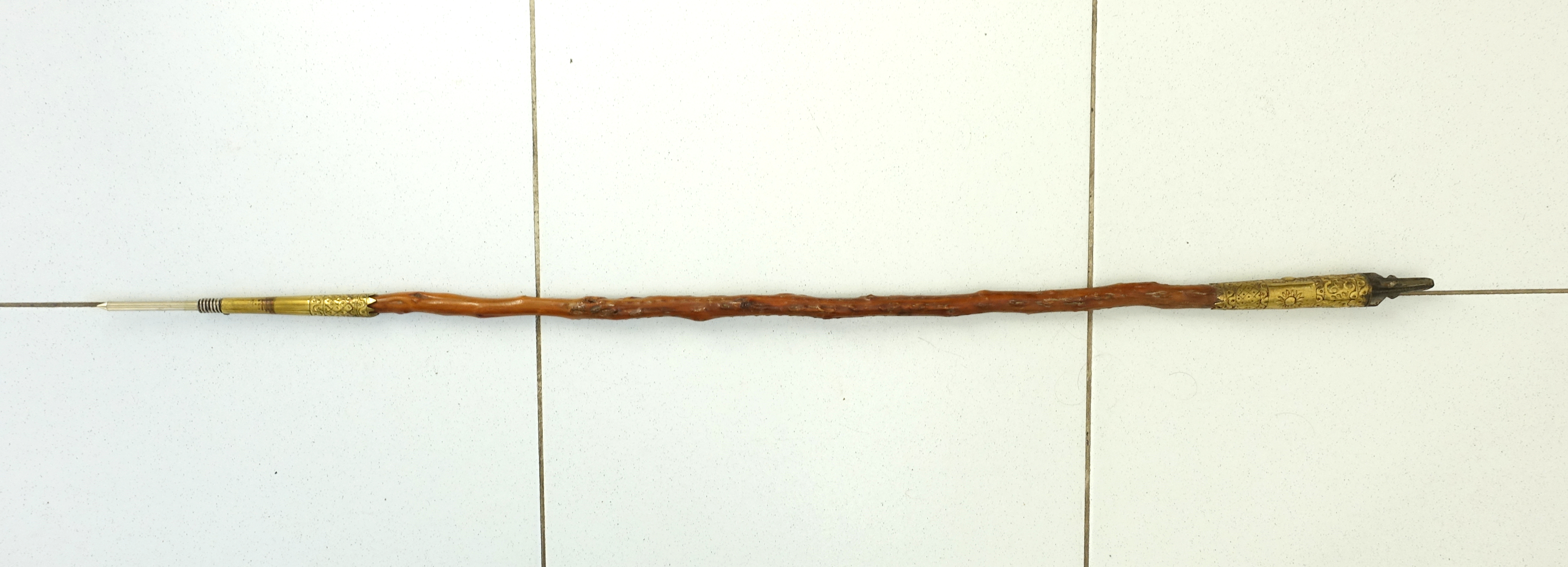 Lorsque le pommeau est dévissé, apparaît une pointe en acier qui sert d'arme. (à gauche sur la photo)