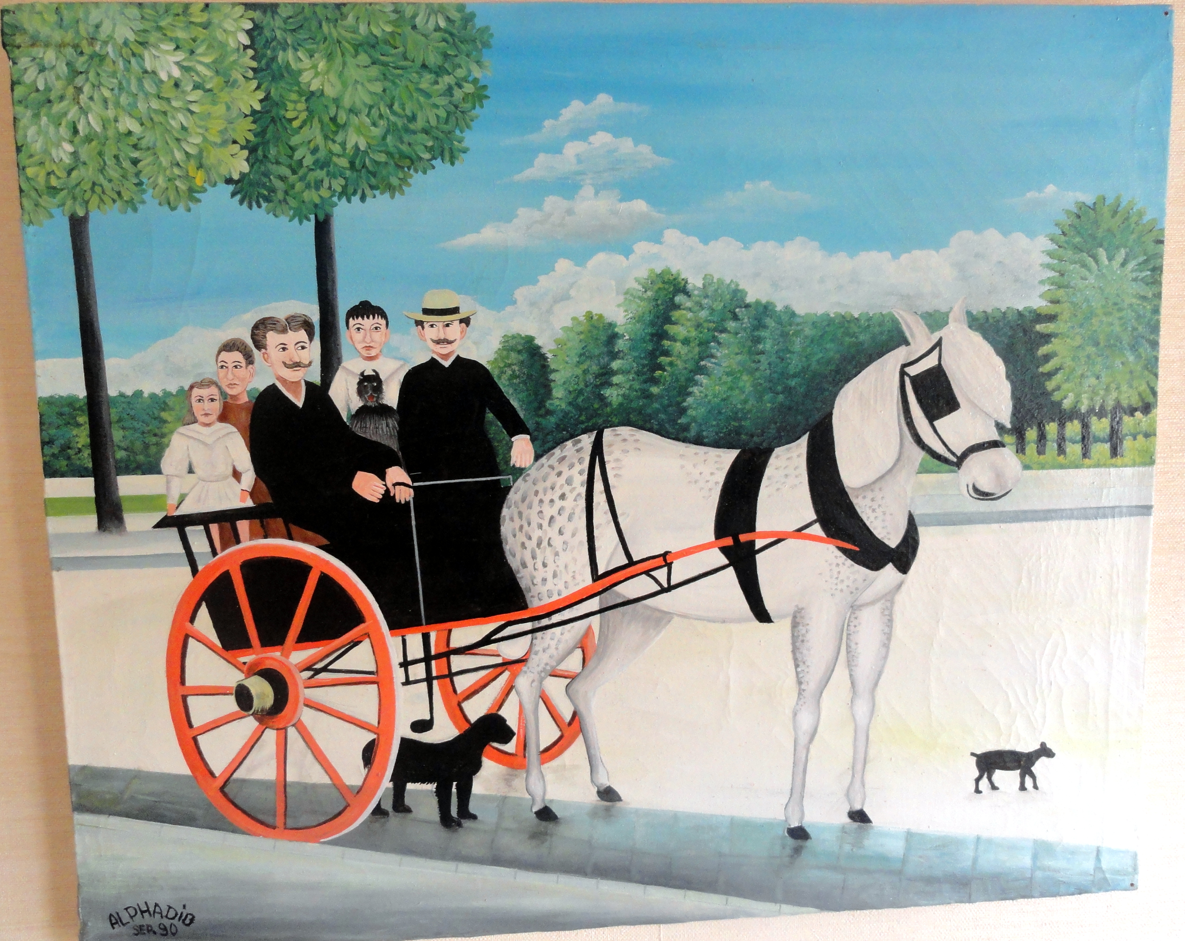 Alphadio est un artiste-peintre dakarois réputé. Il a peint ce tableau La carriole du père Juniet "à la manière du Douanier Rousseau" en 1990.Dimensions : 60 x 50 cm