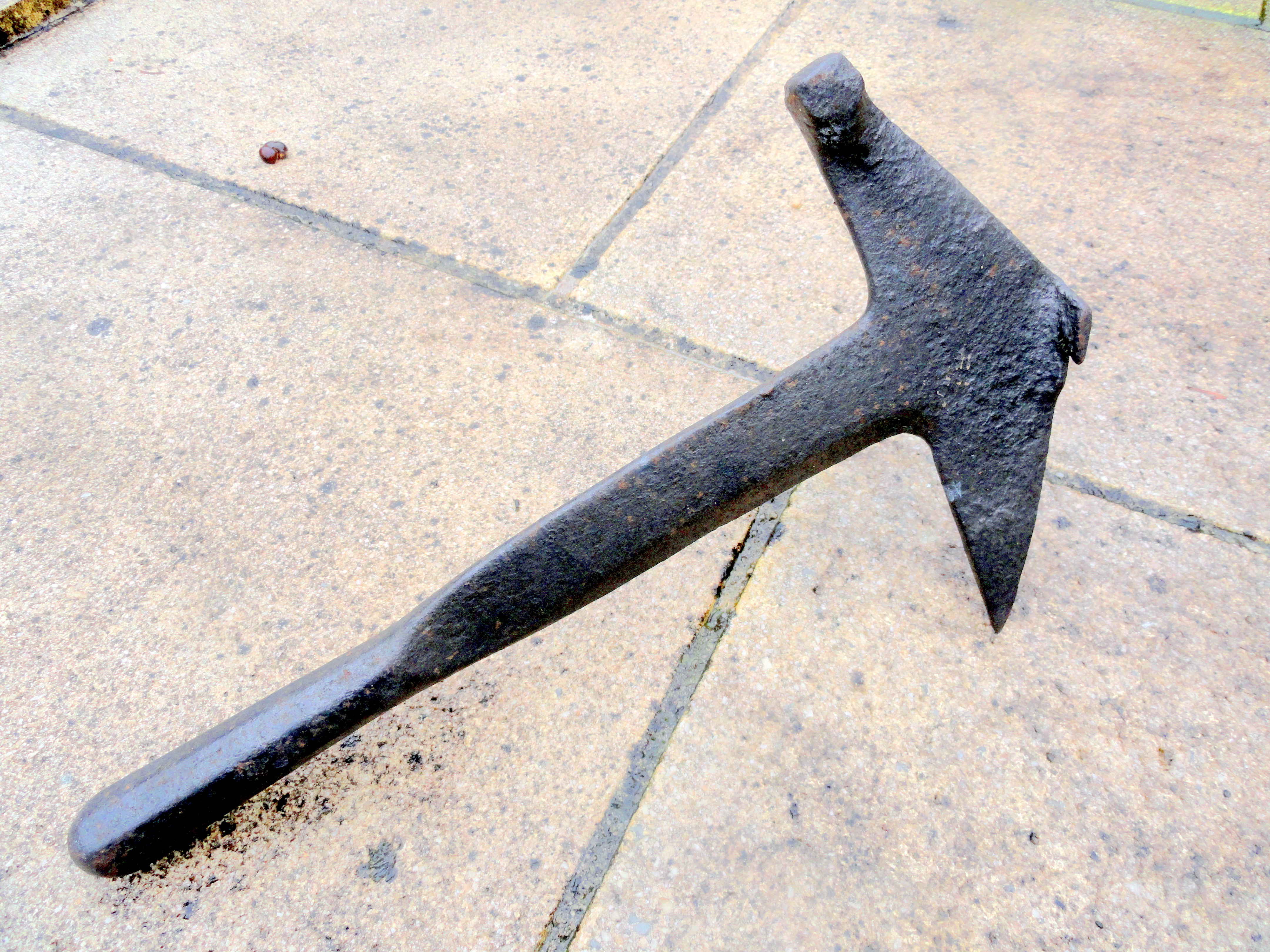 Modèle ancien d'outil. Notez les particularités de ce marteau: le tranchant, la pointe, l'arrache-clou, l'encoche et la tête. L'outil est très bien décrit sur un site spécialisé pour les ardoisiers.(Coll. JC Jacquetin)