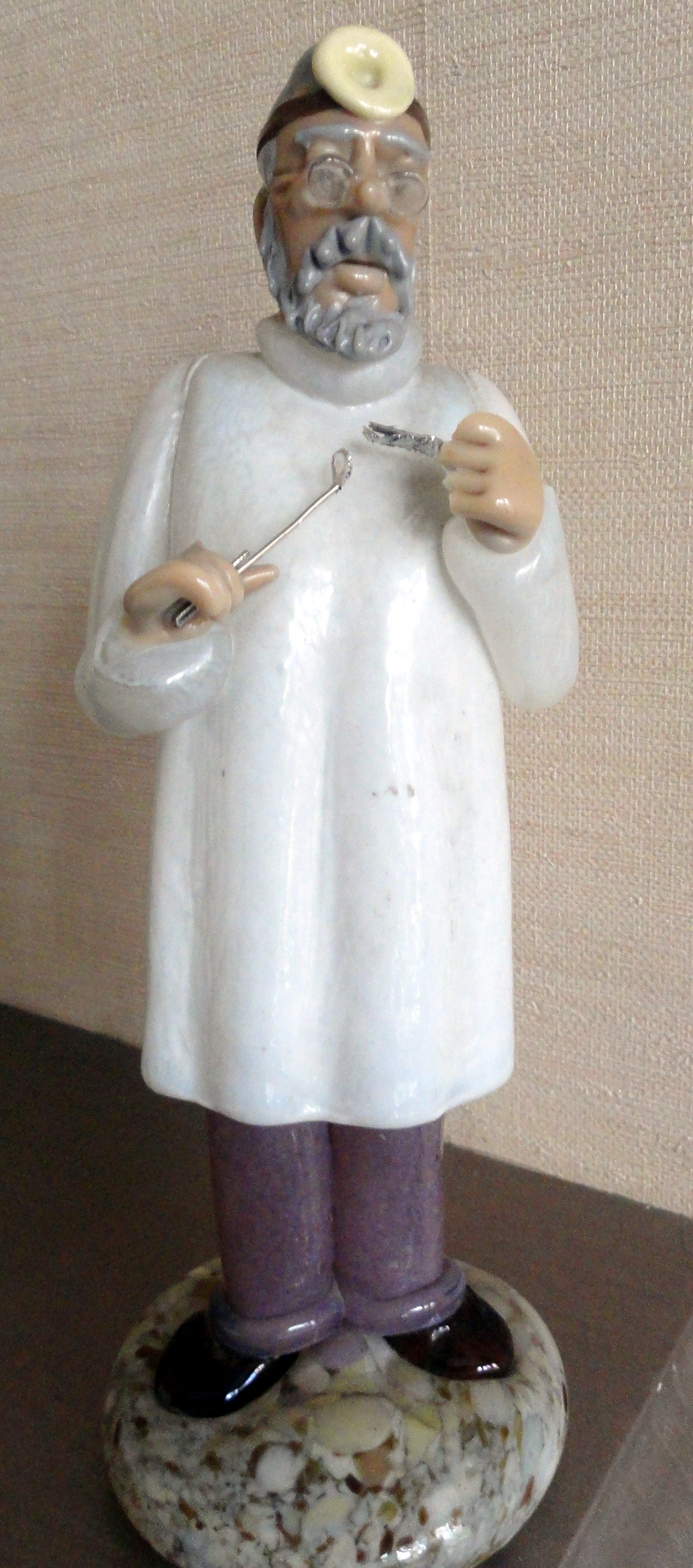 Stautuette en verre de Murano de médecin ORL avec son miroir de tête Ziegler.Hauteur: 22 cm