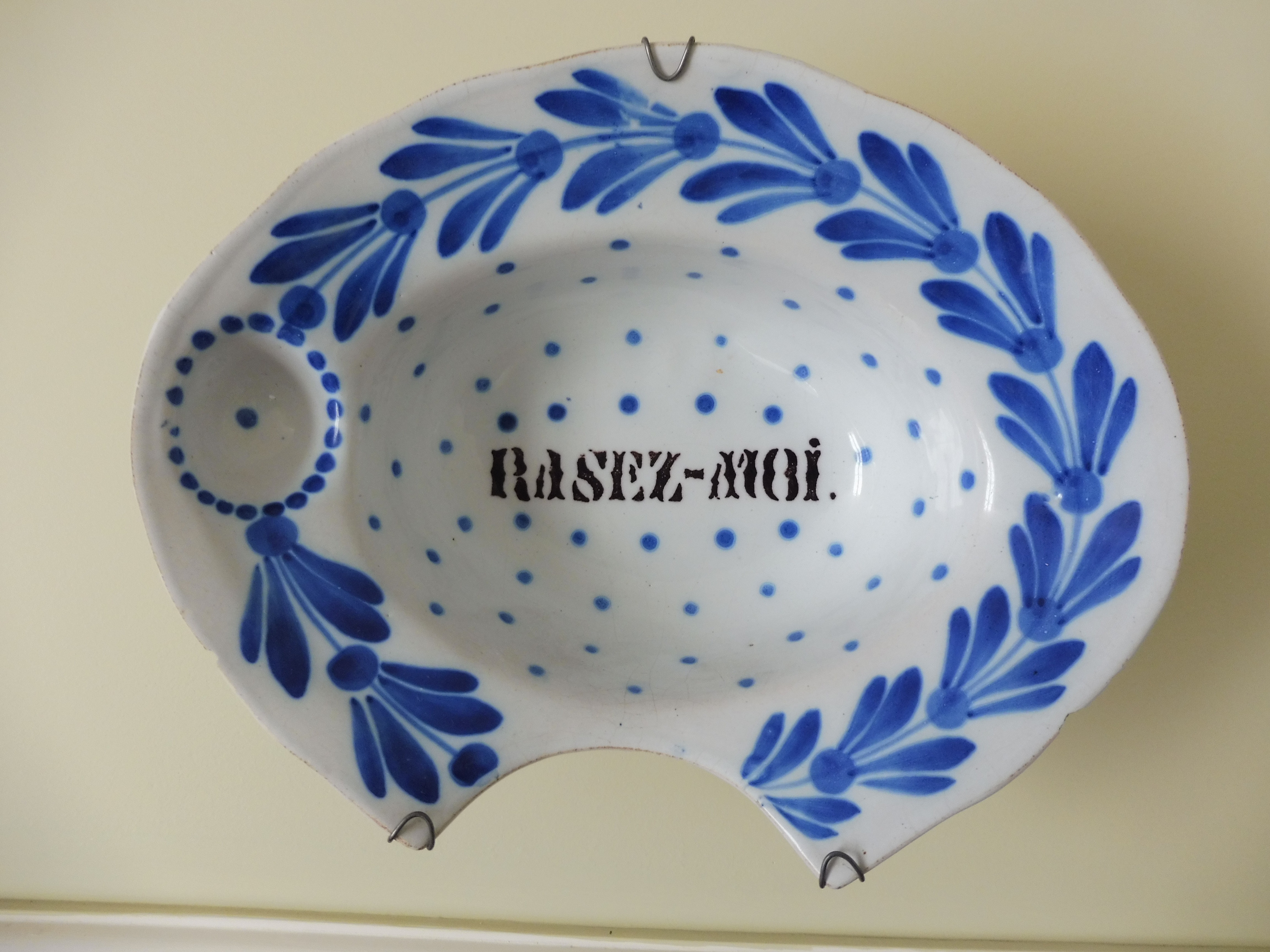 Il est ovale, creux, en faïence avec décors bleus et inscription "rasez-moi".