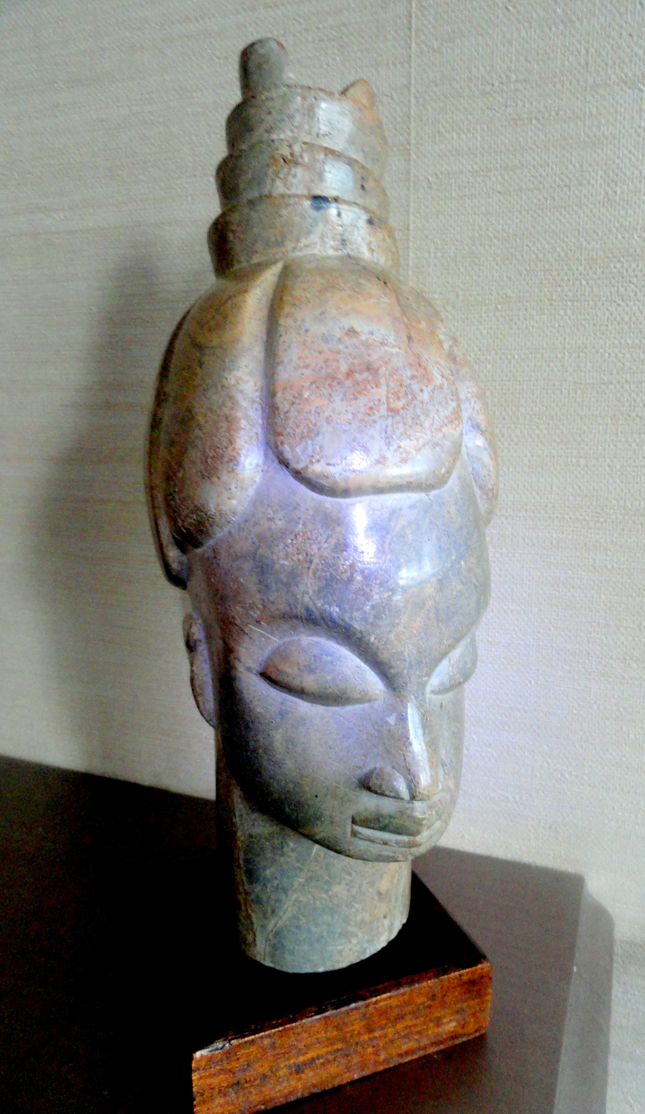 Statuette africaine, en pierre, origine inconnue Semble avoir été taillée dans un cylindre de pierre, couleur vert foncé veiné de brun orangé (coll. G. Charmot) (Hauteur 18 cm; diamètre: 5 cm env. ; poids: 720 g)- origine Songyé, sud-est de la RDC