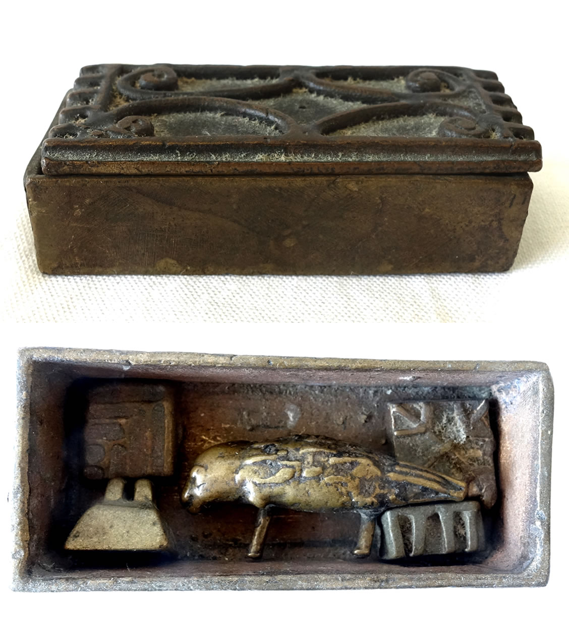 Boîte rassemblant des éléments de l'attirail du peseur d'or