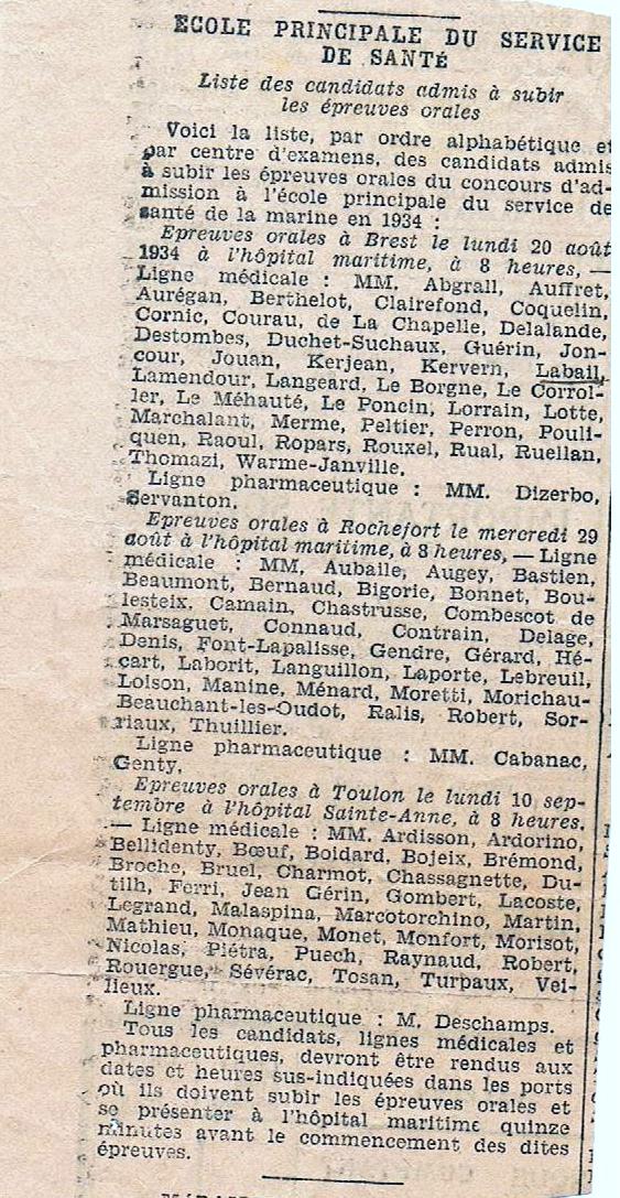 Coupure d'un journal non identifié et non daté donnant les listes des candidats admis à subir les les épreuves orales du concours d'entrée à l'École principale du service de santé navale à Brest, Rochefort et Toulon en août et septembre 1934