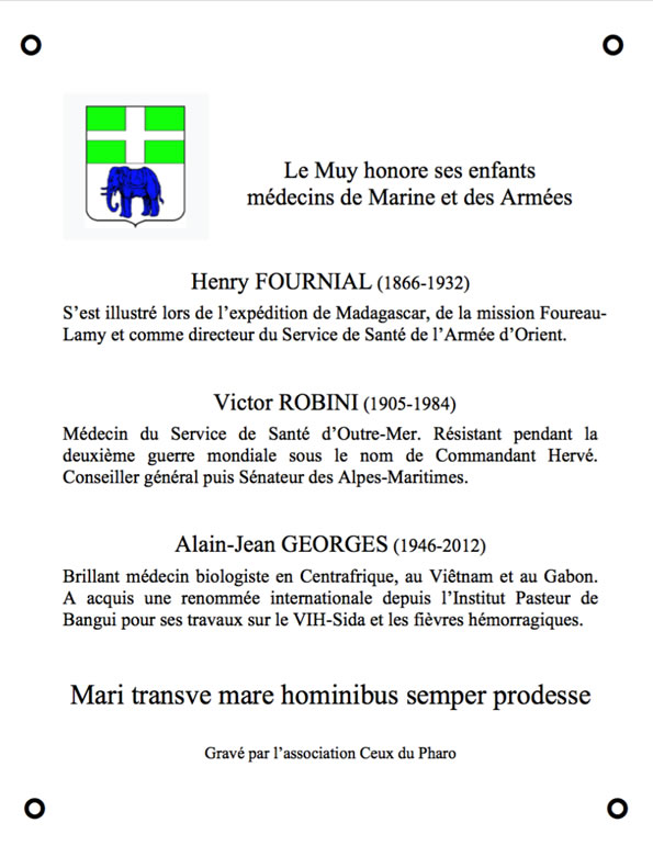 Un des principaux buts de Ceux du Pharo est la promotion de la mémoire des Anciens du Pharo. À notre demande, la mairie du Muy (Var) a accepté d’apposer au mois d’avril 2019 une grande plaque (1m x 1m50) rappelant que trois médecins militaires originaires du Muy se sont illustrés sur divers théâtres.