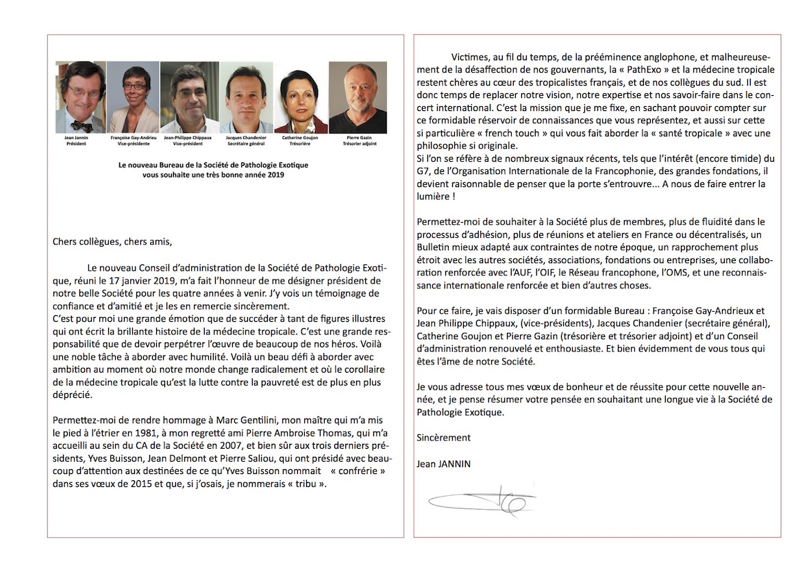 Le nouveau président de la Société de pathologie exotique, Jean Jannin, et son bureau vous adressent leurs vœux pour l'année 2019.